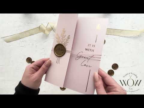 Elevate your wedding with these gold foil printed acrylic wedding invitations. These modern and elegant wedding invitations are perfect for any romantic celebration, featuring a blush pink folded jacket and personalized wax seal options.