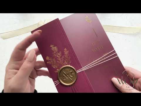 Announce your wedding with these gold foil printed acrylic wedding invitations, featuring a sophisticated burgundy folded cover, wax seal option, and luxurious gold accents for a timeless look.