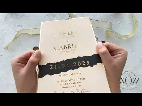 Announce your wedding with these elegant black and gold wedding invitations, featuring a beige card, custom envelope, and gold foil details for a minimalist and sophisticated design.