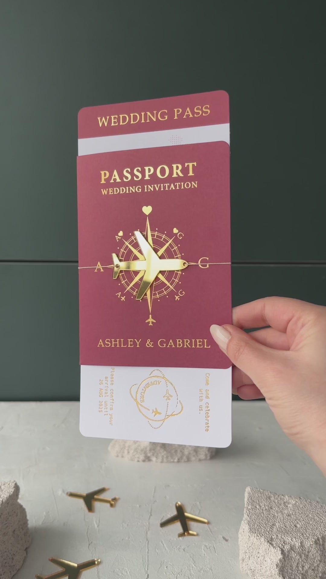 Experience a unique and elegant wedding with our all-in-one burgundy wedding passport invitation. Featuring a passport-style design and gold foil printing, these invitations are perfect for destination weddings. Give your guests the experience of receiving a personalized boarding pass invite and set the tone for your special day.
