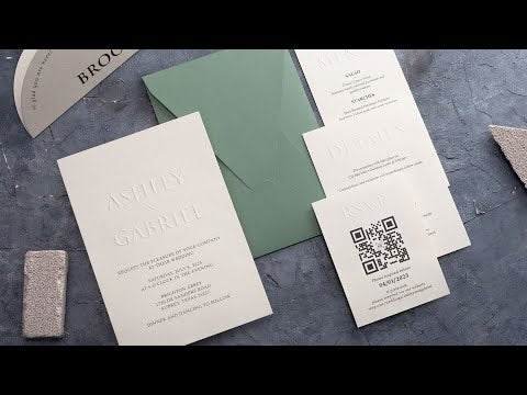 A beautifully embossed ivory wedding invitation paired with a soothing sage green envelope. Perfect for elegant and timeless weddings.