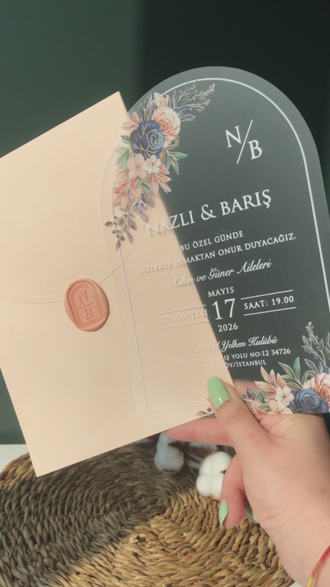 Make your wedding unforgettable with this arch-shaped acrylic invitation featuring a floral design, a blush envelope, and optional wax seal for added elegance.