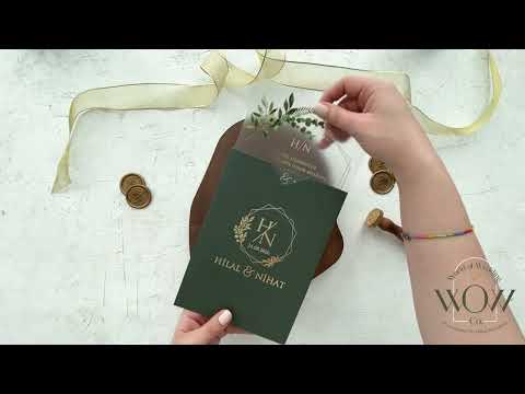 Gold Foil Acrylic Invitation with Green Leaves and Envelope
