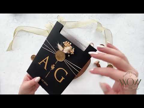 Make your wedding unforgettable with these luxury black and gold acrylic invitations, featuring a sleek black sleeve envelope, gold foil print, and monogram design. Optional wax seal and dried flowers add a personal, elegant touch. Perfect for formal and modern weddings, these invitations are a statement of sophistication and style.