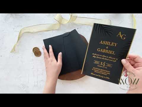 Make a bold statement with these luxury black wedding invitations, featuring gold foil print, palm leaf accents, and a matching black envelope with a monogram. Perfect for modern, tropical, or formal weddings, this elegant design combines sophistication and style.