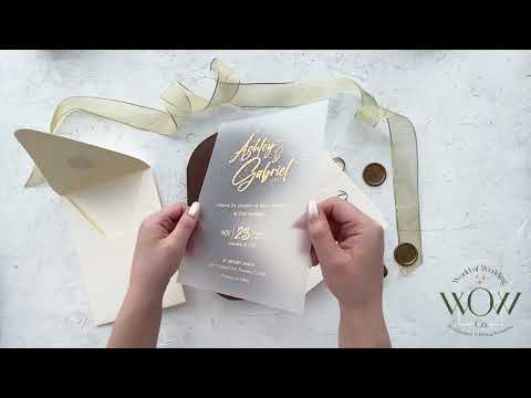 Make a statement with our acrylic wedding invitations, featuring luxurious gold foil lettering and a classic cream envelope with a matching gold monogram. Perfect for elegant and modern weddings, these invitations are fully customizable to reflect your unique style.
