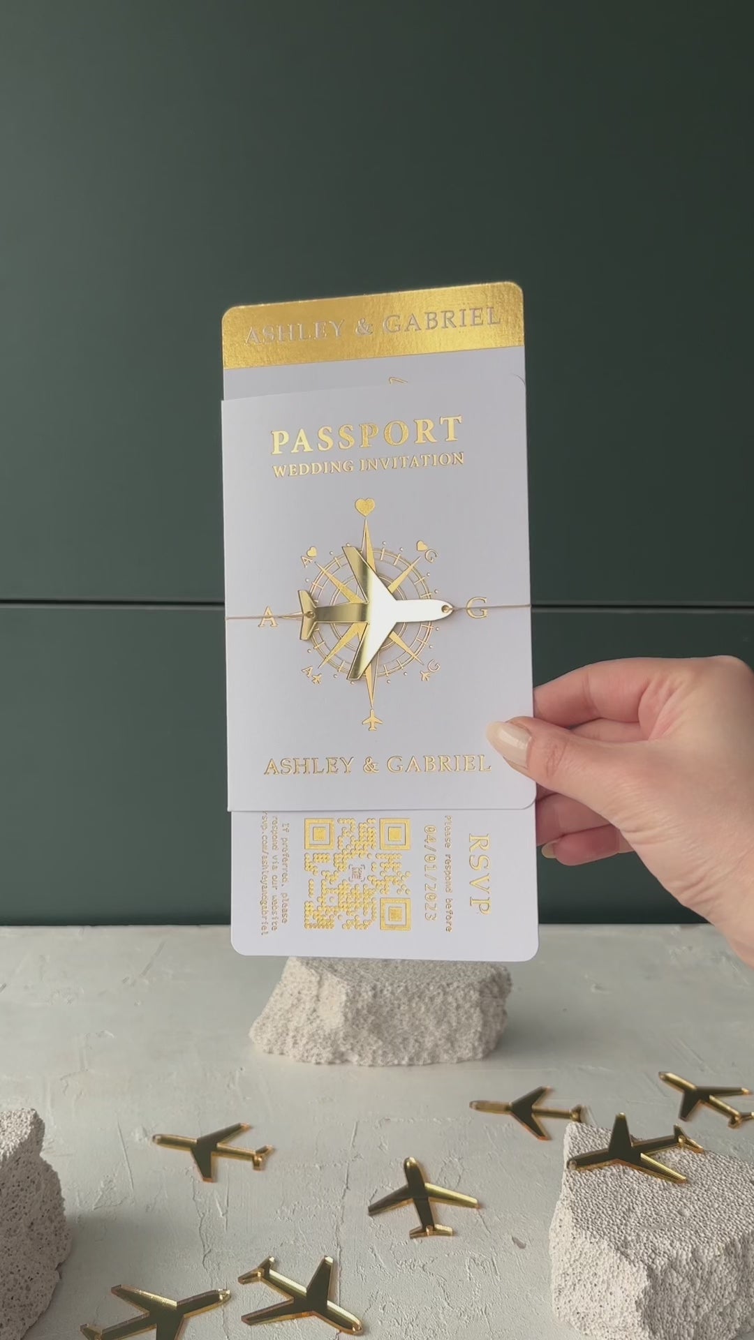 White Passport Wedding Invitation with Gold Foil