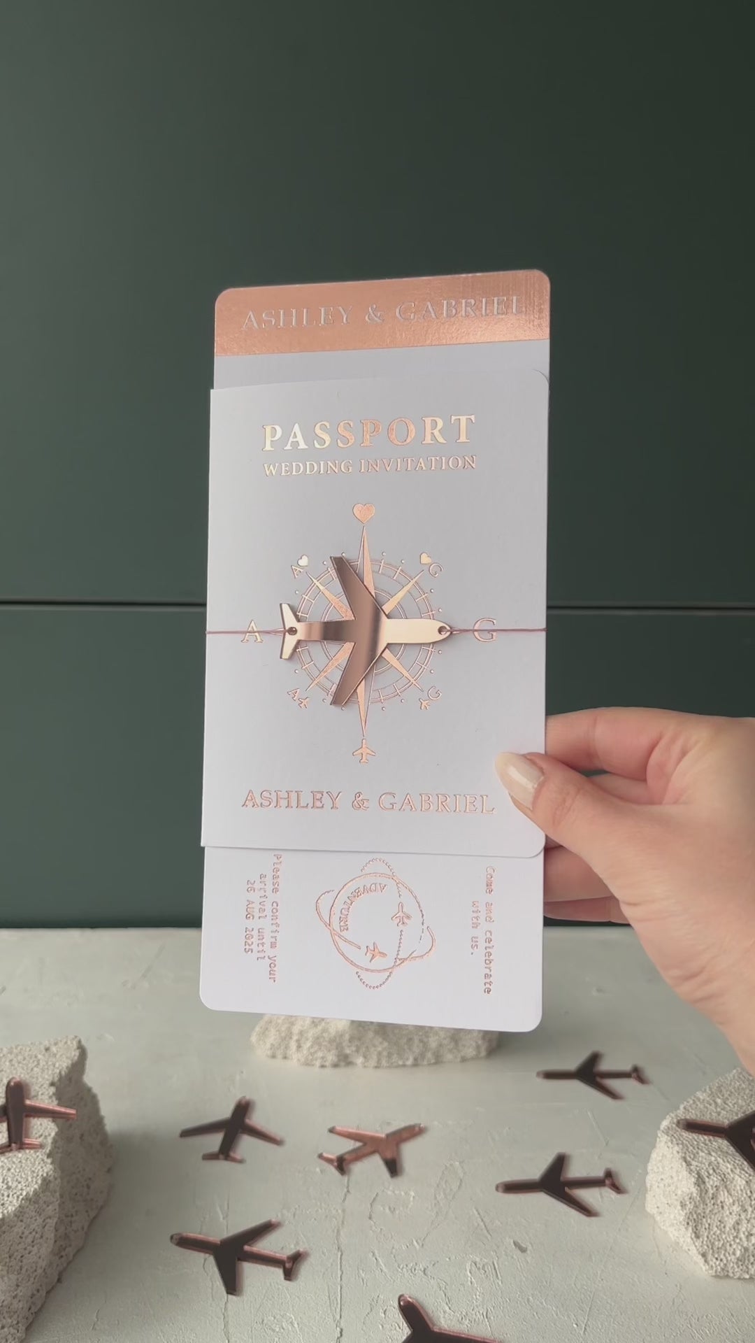 White Passport Wedding Invitation with Rose Gold Foil